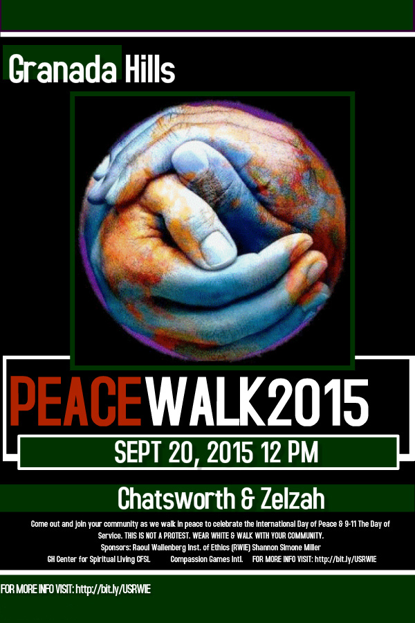 The Raoul Wallenberg Institute is excited to bring you the 2nd Annual Granada Hills Peace Walk.Come Out Sept 20 2015 at NOON and Walk with your community to celebrate the International Day of Peace 9-21, & honor 9-11 The Day of service. Wear all white and walk in Peace and unity. Children & pets Welcome. This is not a protest rather a celebration of Peace & community. Meet at the Corner of Chatsworth & Zelzah at The Granada Hills Veterans Memorial.