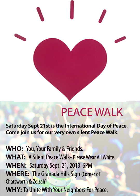 Saturday Sept 21st is the International Day of Peace.Come join us for our very own silent Peace Walk.WHO: You, Your Family & Friends.WHAT: A Silent Peace Walk- Please Wear All White.WHEN: Saturday Sept. 21, 2013 6PMWHERE: The Granada Hills Sign (Corner ofChatsworth & Zelzah)WHY: To Unite With Your Neighbors For Peace.
